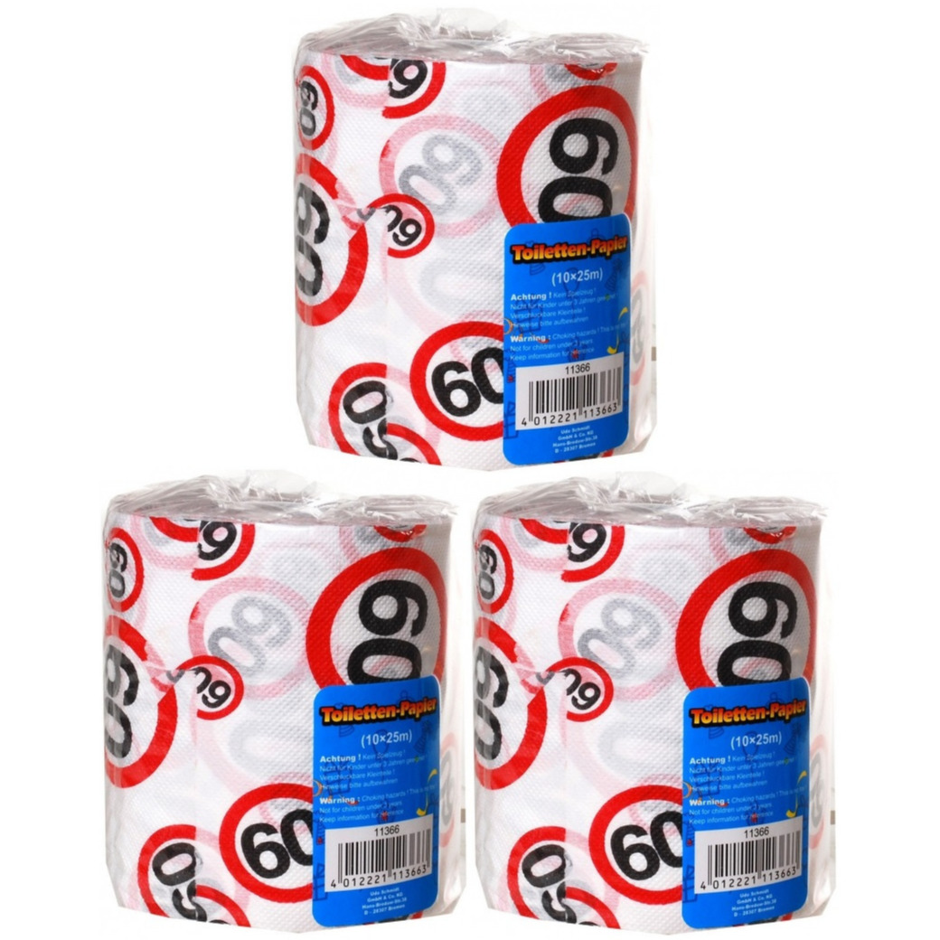 60 jaar verjaardag cadeau – Set van 3x stuks – wc/toiletpapier – 25m – verkeersborden