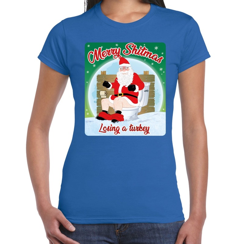 Fout kerst t-shirt merry shitmas turkey blauw voor dames